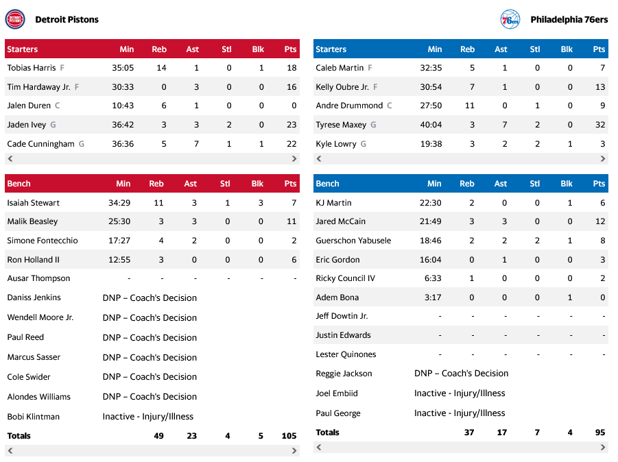 Πρωταγωνιστής για την ομάδα του Ντιτρόιτ ο Κάνιγχαμ με 22 π΄οντους και 7 ριμπάουντ, με τον Άιβι να σημειώνει 23 πόντους. Από την ομάδα της Φιλαδέλφεια, ο Μάξεϊ με 32 πόντους και 7 ασίστ.