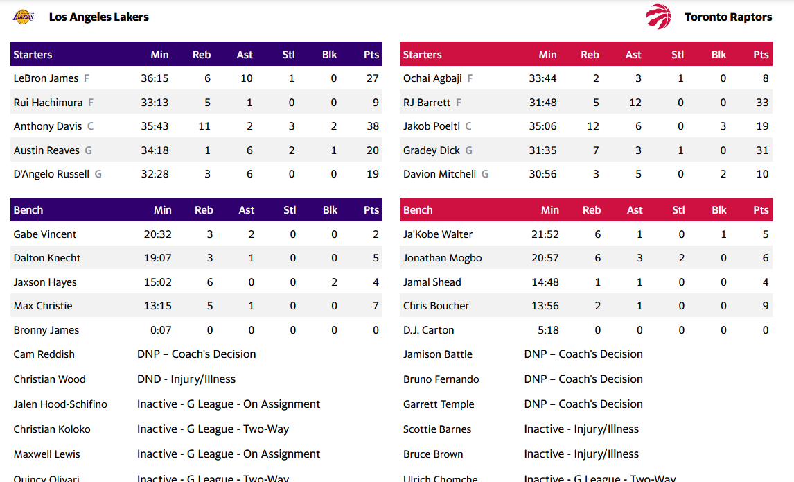 Κορυφαίος για τους Λιμνανθρώπους ο Άντονι Ντέιβις με 38 πόντους και 11 ριμπάουντ, με τον "Βασιλιά" να ακολουθεί με 27 πόντους και 10 ασίστ. Από τους Καναδούς ξεχώρισαν οι Μπάρετ και Ντικ, με 33 και 31 πόντους αντίστοιχα.