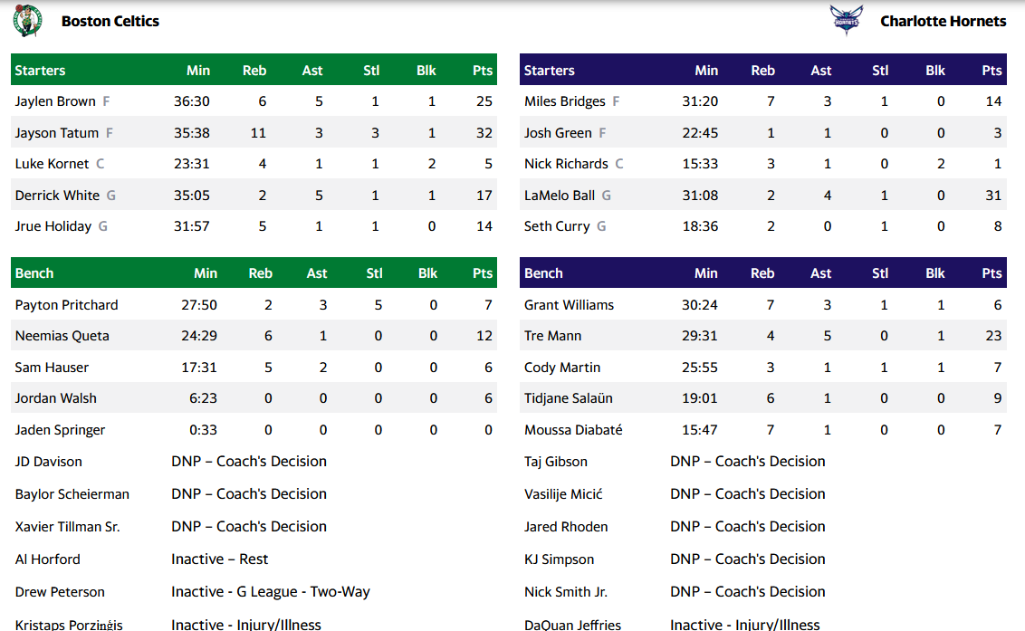 Κορυφαίος για τους Κέλτες ήταν ο Τζέισον Τέιτουμ με 32 πόντους και 11 ριμπάουντ, με τον Τζέιλεν Μπράουν να πετυχαίνει ακόμη 25. Για την ομάδα της Σάρλοτ, οι ΛαΜέλο Μπολ με 31 πόντους και ο Τρε Μαν με 23 ήταν αυτοί που ξεχώρισαν.