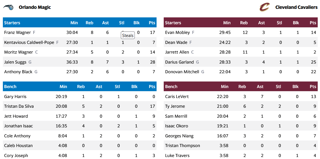 Κορυφαίος για την ομάδα του Κλίβελαντ ο Γκάρλαντ με 25 πόντους ενώ ο Μίτσελ είχε 22. Από το Ορλάντο ο Σαγκς με 28 προσπάθησε να κρατήσει κοντά την ομάδα του αλλά δεν είχε αντίστοιχη βοήθεια από τους υπόλοιπους συμπαίκτες του.