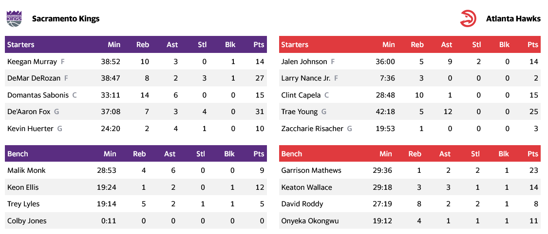 Κορυφαίος ο Φοξ με 31 πόντους, ενώ ακολούθησε στο σκοράρισμα με 27 ο ΝτεΡόζαν. Για τους Χοκς, οι 25 πόντοι και 12 ασίστ του Γιανγκ δεν ήταν αρκετοί για το κάτι παραπάνω.