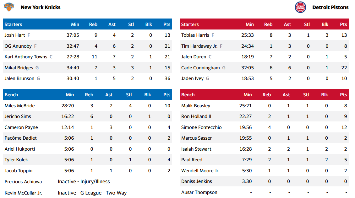 Οι Νικς πέρασαν από το Ντιτρόιτ χωρίς να δυσκολευτούν και πέτυχαν την την τρίτη τους νίκη σε 5 αγώνες, με εξαιρετική εμφάνιση από τον Τζέιλεν Μπράνσον που σταμάτησε στους 36 πόντους. Θετικός για ακόμη μια φορά ο Καρλ-Άντονι Τάουνς που έκανε double-double με 21 πόντους και 11 ριμπάουντ. Για τους Πίστονς, ο Κάνιγχαμ ήταν αυτός που ξεχώρισε με 22 πόντους, 6 ριμπάουντ και 6 ασίστ.