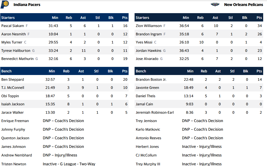 Οι Πέλικανς με εξαιρετική εμφάνιση από τον Ζάιον Γουίλιαμσον που σημείωσε 34 πόντους μαζί με 10 ασίστ κατάφεραν να πάρουν τη νίκη απέναντι στους Πέισερς με 125-118. Από την ομάδα της Ιντιάνα ξεχώρισε ο Σέπαρντ που σημείωσε 20 πόντους.