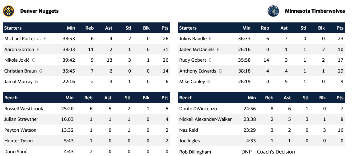 Κορυφαίος για τους νικητές ο Άντονι Έντουαρτς με 29 πόντους, 4 ριμπάουντ και 4 ασίστ, με τον Ραντλ να προσθέτει ακόμη 23 πόντους και τον Γκομπέρ να κάνει double-double με 17 πόντους 14 ριμπάουντ. Από το Ντένβερ οι Γκόρντον και Γιόκιτς ήταν αυτοί που διακρίθηκαν, με τον Αμερικανό να έχει 31 πόντους και 11 ριμπάουντ ενώ ο Σέρβος 26 πόντους και 13 ασίστ.
