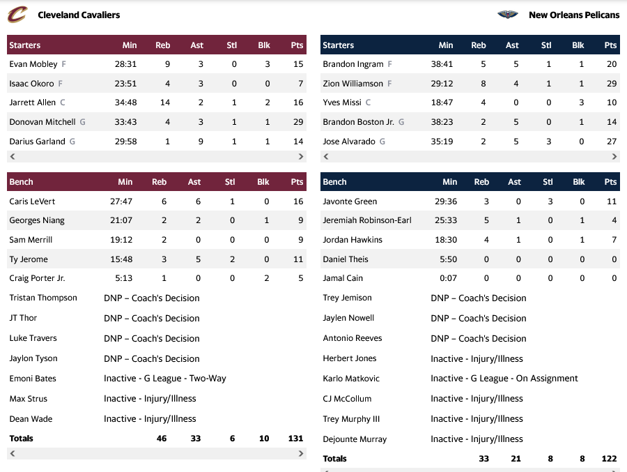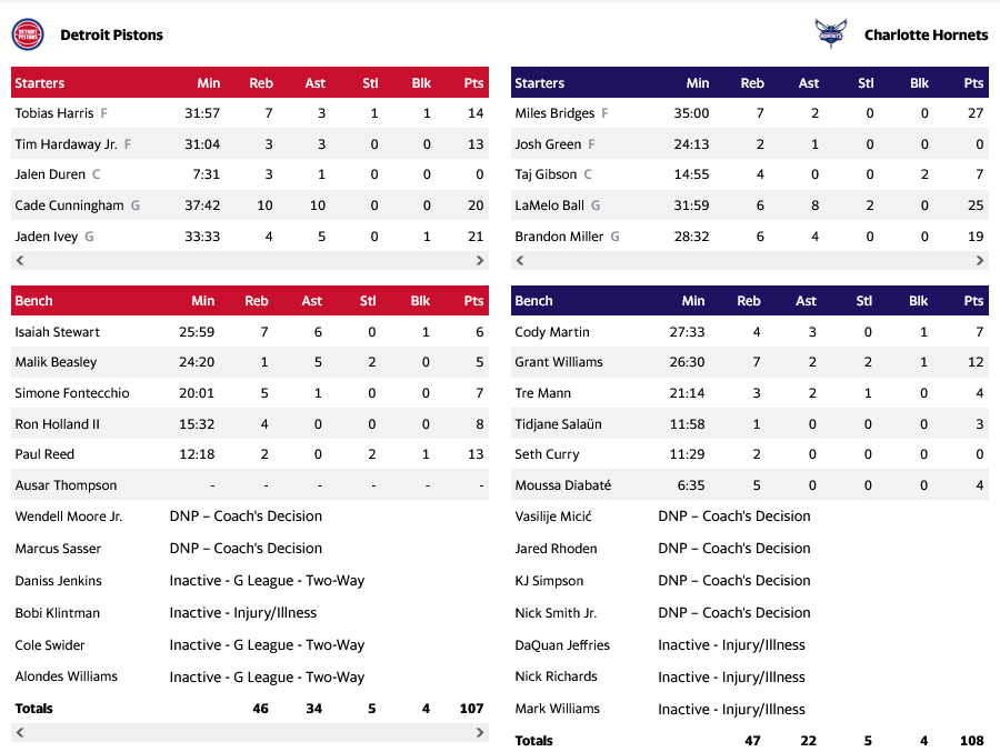 Μπρίτζες με 27 πόντους και Μπολ με 25 ξεχώρισαν από τους νικητές, που είχαν και τον Μίλερ με 19. Για τους Πίστονς, ο Άιβι είχε 21 πόντους με τον Κάνιγκχαμ να κάνει triple double με 20 πόντους, 10 ριμπάουντ και ισάριθμες ασίστ.