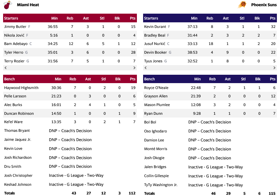 Νίκη με ανατροπή για τους Σανς, που επέστρεψαν από το -15 (64-79), για να φτάσουν στην νίκη με 115-112. Απολαυστικός ο Ντουράντ με 32 πόντους, με τον Μπούκερ να έχει 22 και τον Νούρκιτς να κάνει ένα εμφατικό double – double με 20 πόντους και 18 ριμπάουντ.