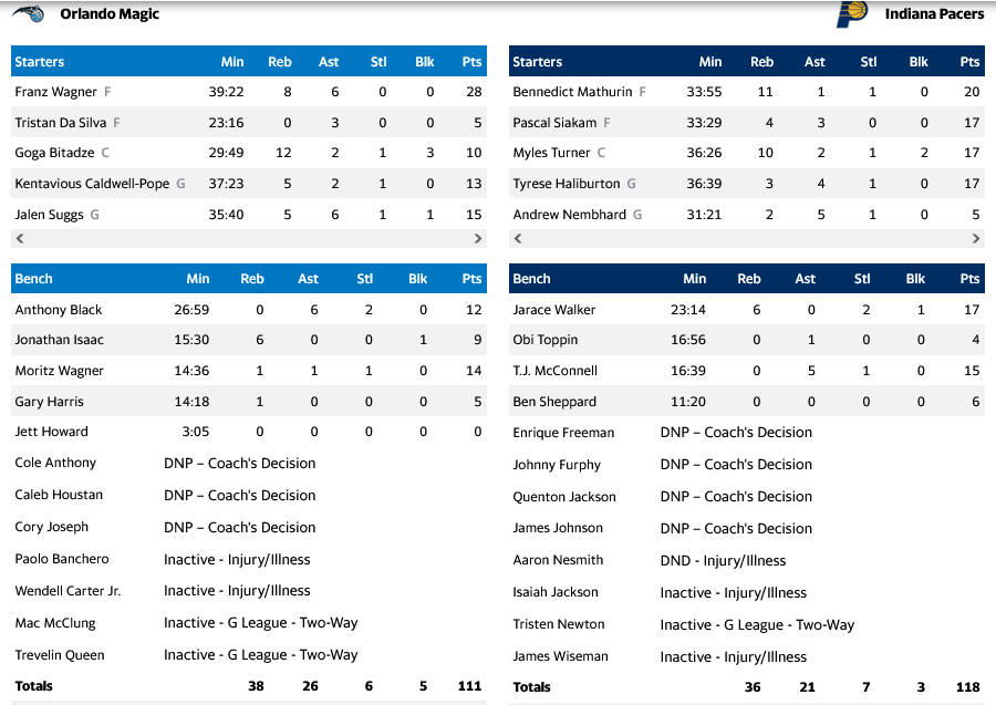 20 πόντοι και 11 ριμπάουντ ήταν ο απολογισμός του Μάθουριν, με τους Χαλιμπάρτον, Σιάκαμ, Τέρνερ και Γουόκερ να έχουν από 17 έκαστος. Για το Ορλάντο, ο Φραντζ Βάγκνερ είχε 28 πόντους, ο Σαγκς 15 και ο Μο Βάγκνερ 14 πόντους.