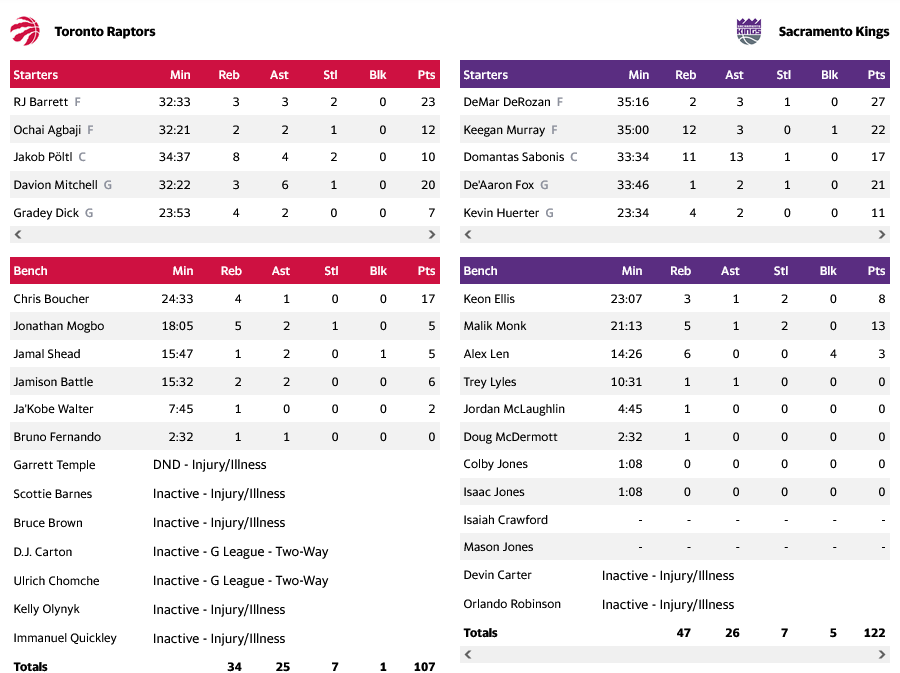 27 πόντους πέτυχε ο ΝτεΡόζαν, με τον Μάρεϊ να κάνει double – double με 22 πόντους και 12 ριμπάουντ, ενώ ο Φοξ πρόσθεσε 21 πόντους. Κορυφαίος όλων, όμως, ήταν ο απίθανος Ντομάντας Σαμπόνις, που έκανε triple double χωρίς να χάσει σουτ, έχοντας 17 πόντους, 11 ριμπάουντ και 13 ασίστ.