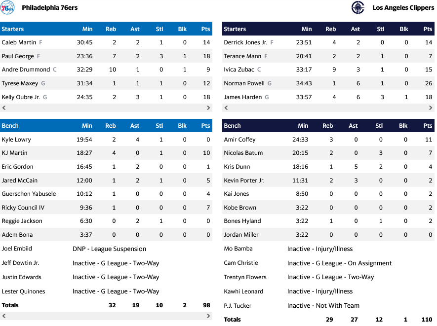 26 πόντοι ήταν ο απολογισμός του Πάουελ, με τον Χάρντεν να έχει 18 και τον Ζούμπατς 15 πόντους. Για τους Σίξερς, που αγωνίστηκαν για ακόμα ένα ματς χωρίς τον Εμπίντ, ο Τζορτζ με τον Ούμπρε είχαν από 18 πόντους.