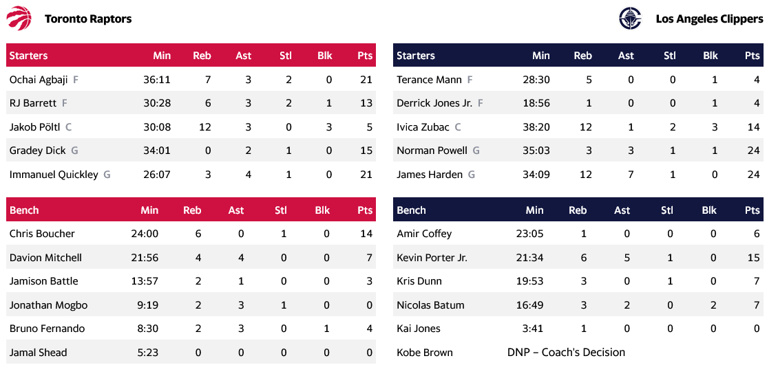 Πολυτιμότερος για τους νικητές ήταν ο Τζέιμς Χάρντεν, με 24 πόντους και 12 ασίστ, ενώ συμπαραστάτες του ήταν οι Νόρμαν Πάουελ με 24 πόντους και Κέβιν Πόρτερ Τζούνιορ με 15. Από τους Καναδούς ξεχώρισε ο Κουίκλεϊ με 21 πόντους και 4 ασίστ.
