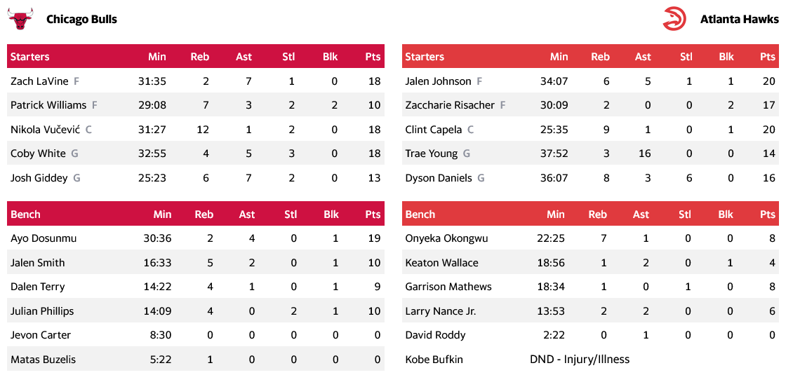Πρωταγωνιστής για τους "Ταύρους" ήταν ο Νίκολα Βούσεβιτς με 18 πόντους και 12 ριμπάουντ, με συμπαραστάτες τους Ντοσούνμου και ΛαΒίν με 19 και 18 πόντους αντίστοιχα. Για τους Χοκς ο Τρέι Γιανγκ με 14 πόντους και 16 ασίστ ήταν αυτός που ξεχώρισε, μαζί με τον Κλιντ Καπέλα που είχε 20 πόντους και 9 ριμπάουντ.