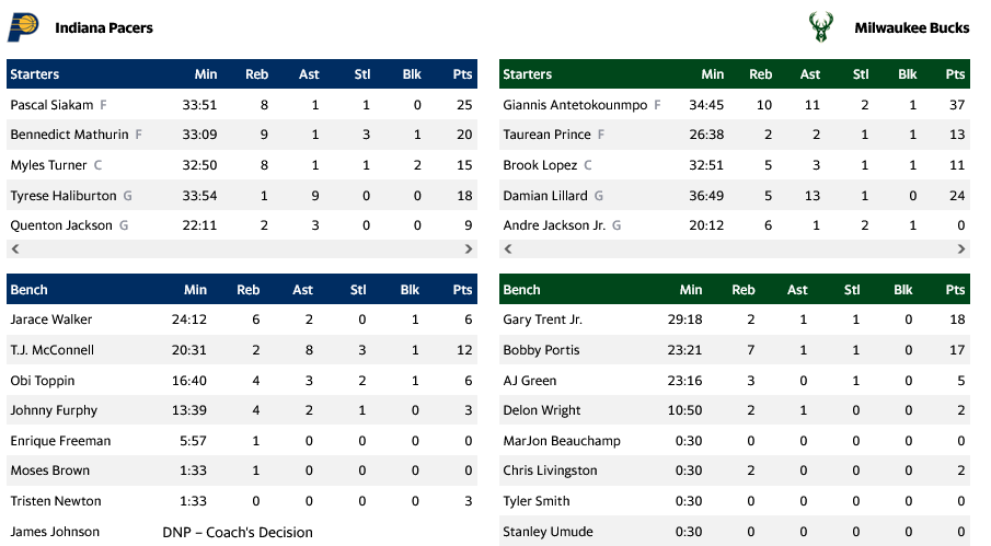 Συμπαραστάτης του Γιάννη ήταν ο Λίλαρντ, ο οποίος πέτυχε 24 πόντους, έχοντας και 13 ασίστ, με τους Τρεντ και Πόρτις (18 και 17 πόντοιν αντίστοιχα) να δίνουν πολύτιμες λύσεις από τον πάγκο. Από τους Πέϊσερς ξεχώρισαν οι Σιάκαμ με 25 πόντους και 8 ριμπάουντ, Μάθουριν με 20 πόντους και 9 ριμπάουντ και ο Χαλιμπέρτον με 18 πόντους και 9 ασίστ.