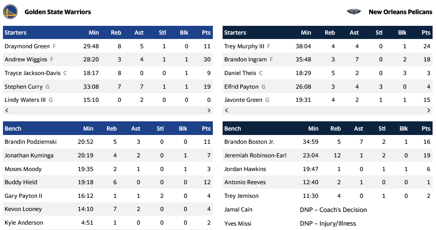 Οι "Πολεμιστές" εκμεταλλεύτηκαν τις απουσίες των "Πελεκάνων" και έφυγαν από τη Νέα Ορλεάνη με τη νίκη αλλά και την πρόκριση στη νοκ άουτ φάση του NBA Cup, έχοντας πετύχει τρεις νίκες στο γκρουπ (12-3 στην κανονική βαθμολογία), με την ομάδα της Ν΄εας Ορλεάνης να παραμένει χαμηλά, έχοντας 4 νίκες σε 17 αγώνες.
