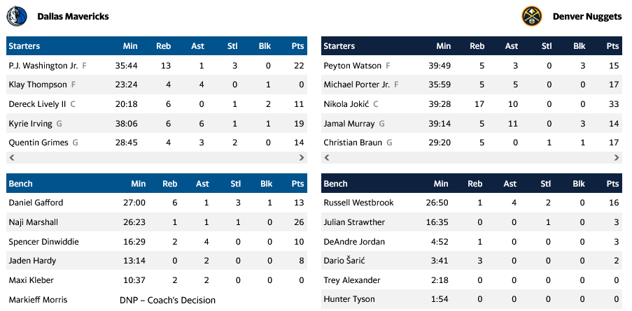 Οι Μάβερικς αν και δεν είχαν στη διάθεση τους τον Λούκα Ντόντσιτς, πέρασαν από το Ντένβερ και επικράτησαν 120-123, έχοντας σε πολύ καλή μέρα παίκτες από τον πάγκο τους που έκαναν step-up.