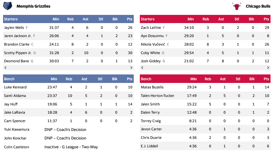 Κορυφαίος για την ομάδα των Γκρίζλις ήταν ο Σκότι Πίπεν Τζ. που πέτυχε 30 πόντους, έχοντας και 10 ασίστ, με τον Γουέλς να προσθέτει ακόμη 26. Από τους "Ταύρους", οι ΛαΒίν και Βούσεβιτς με 29 και 26 ήταν αυτοί που διακρίθηκαν.