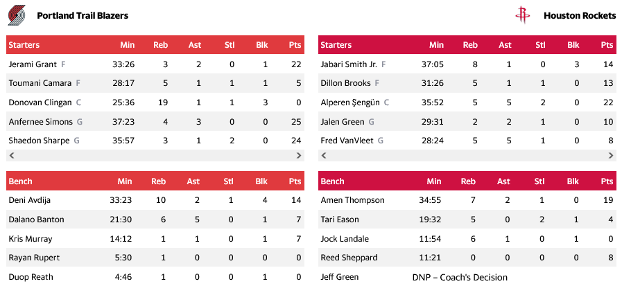 Κορυφαίος για τους νικητές ο Σίμονς με 25 πόντους και συμπαραστάτης του ο Γκραντ με 22, ενώ από τις "Ρουκέτες" ο Σενγκούν με 22 ήταν αυτός που ξεχώρισε.