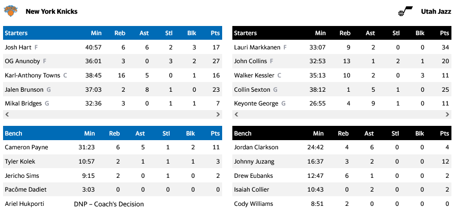 Οι Μορμόνοι ήταν ανώτεροι από τους Νεοϋορκέζους, ελέγχοντας σχεδόν το παιχνίδι από το πρώτο δωδεκάλεπτο και έφτασαν σε μια μεγάλη νίκη, καθώς ήταν η 4η μετά από 16 αγώνες. Οι Νικς "υποχώρησαν" στο 9-7 και τη 4η θέση στην Ανατολή.