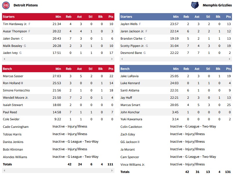 Άνετο βράδυ είχαν οι Γκρίλις επί των Πίστονς, με τους νικητές να έχουν ως πρώτους σκόρερ τους ΛαΡάβια και Πίπεν Τζούνιορ με 19 πόντους έκαστος, ενώ από την άλλη οι ηττημένοι είχαν πρώτο σκόρερ τον Σάσερ με 22 πόντους.