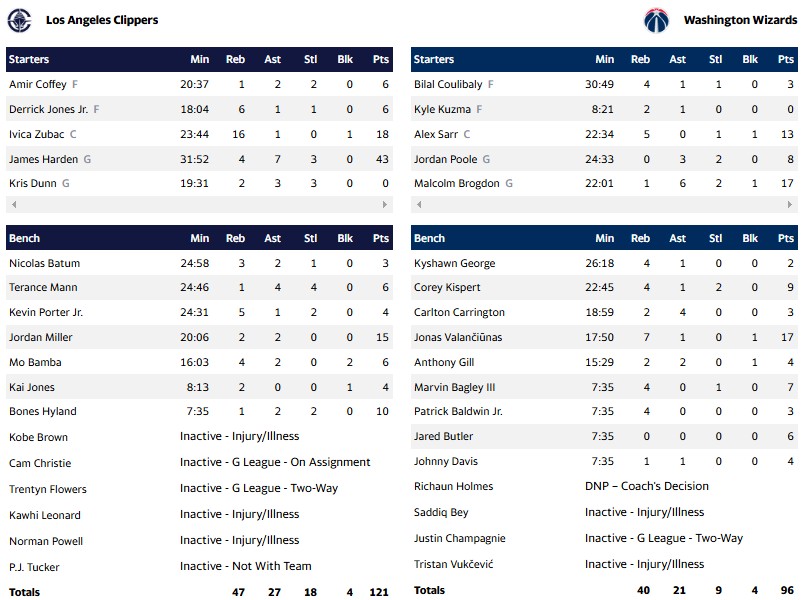 Εμφατική εκτός έδρας νίκη έκαναν οι Κλίπερς μέσα στην Ουάσινγκτον, με τους νικητές να έχουν ως πρώτο σκόρερ τον Χάρντεν με 43 πόντους, ενώ από την άλλη για τους ηττημένους ξεχώρισε ο Μπρόγκντον με 17, με τον Βλανσιούνας να σημειώνει επίσης 17.