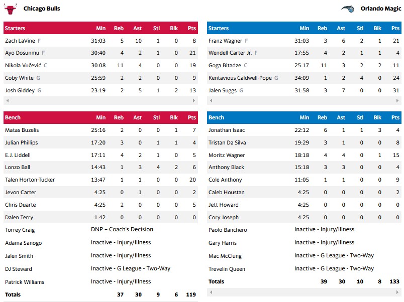 Άλλη μια νίκη στο ενεργητικό τους πρόσθεσαν οι Μάτζικ, που επικράτησαν άνετα τους Μπουλς υπερασπιζόμενοι την έδρα τους. Οι μπλε είχαν πρώτο σκόρερ τον Σαγκς με 31 πόντους, ενώ από την άλλη οι κόκκινοι είχαν ως πρώτο σκόρερ τον Ντουσούνμου με 21 πόντους.