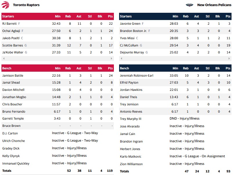 Άνετη ήταν η νίκη των Ράπτορς μέσα στη Νέα Ορλεάνη επί των Πέλικανς, με τους νικητές να έχουν ως πρώτο σκόρερ τον Αγκμπάτζι με 24 πόντους, ενώ ο Μπάρετ ήταν από κοντά με 22.