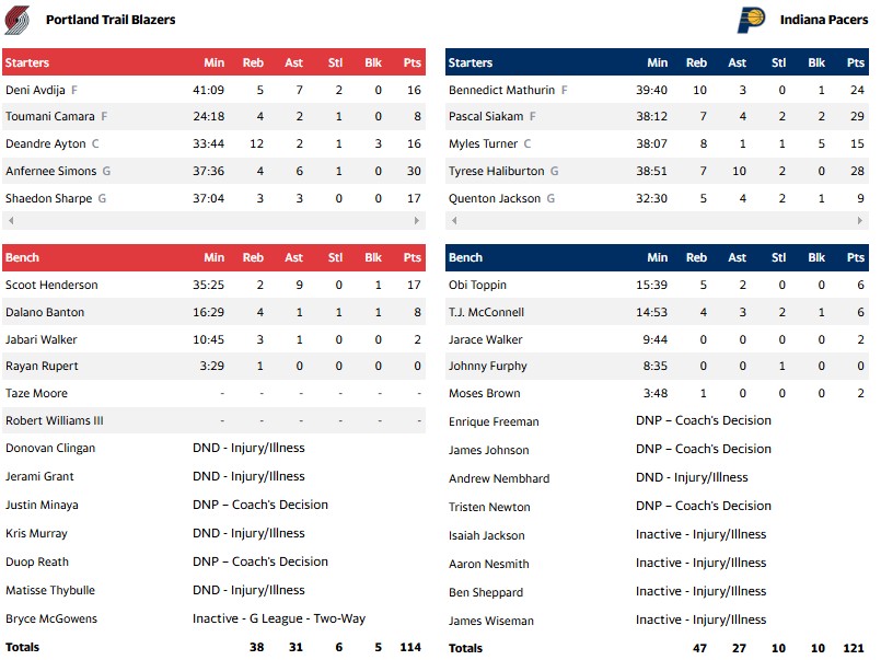 Οι Πέισερς μετά την ήττα από τους Μπακς αντέδρασαν και πήραν σημαντική νίκη κόντρα στους Μπλέιζερς, έχοντας ως πρώτο σκόρερ τον Σιάκαμ με 29 πόντους, με τον Χαλιμπάρτον να ακολουθεί κάνοντας νταμπλ νταμπλ με 28 πόντους, 7 ριμπάουντ και 10 ασίστ.
