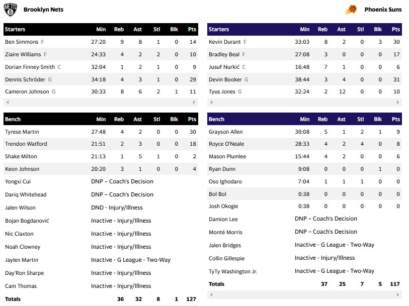 Οι Νετς σημείωσαν μεγάλη νίκη μέσα στο Φοίνιξ επί των Σανς, έχοντας ως πρώτους σκόρερ τους Μάρτιν και Σρέντερ με 30 και 29 πόντους αντίστοιχα, ενώ από την άλλη για τους ηττημένους ξεχώρισαν οι Μπούκερ και Ντουράντ με 31 και 30 πόντους αντίστοιχα.