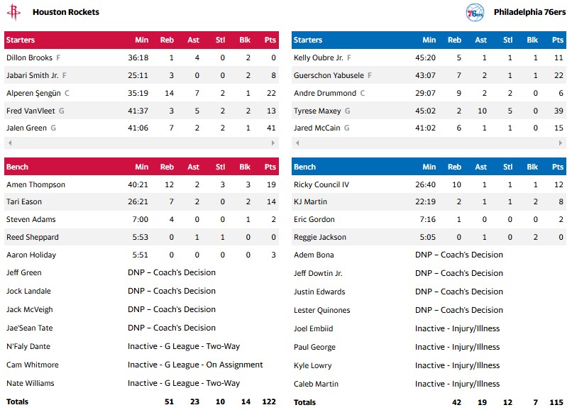 Τρομερό παιχνίδι έγινε στη Φιλαδέλφεια, όπου οι Ρόκετς πήραν μεγάλη νίκη στην παράταση, έχοντας τον Γκριν στους 41 πόντους, την ίδια στιγμή που οι ηττημένοι είχαν ως πρώτο σκόρερ τον Μάξι με 39 πόντους.