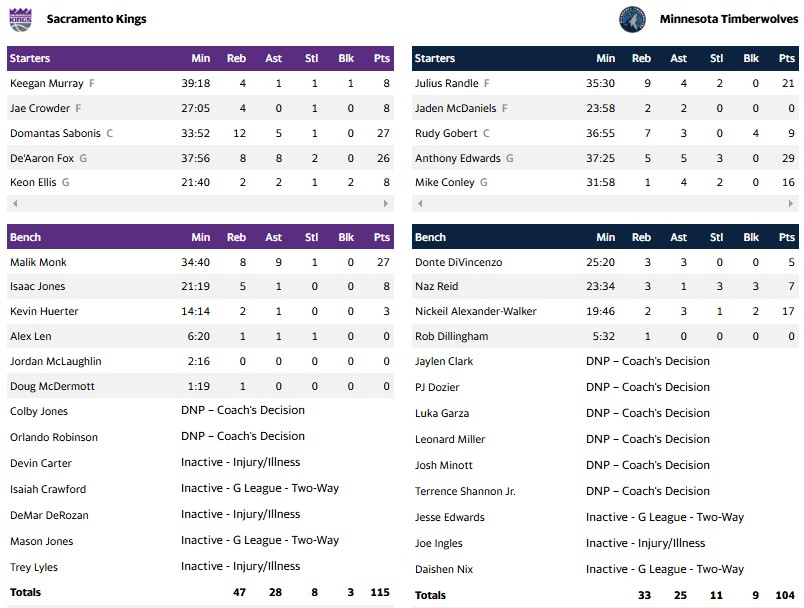 Την έδρα της Μινεσότα άλωσαν οι Κινγκς που είχαν ως πρώτους σκόρερ τους Σαμπόνις και Φοξ που σημείωσαν 27 και 26 πόντους αντίστοιχα.