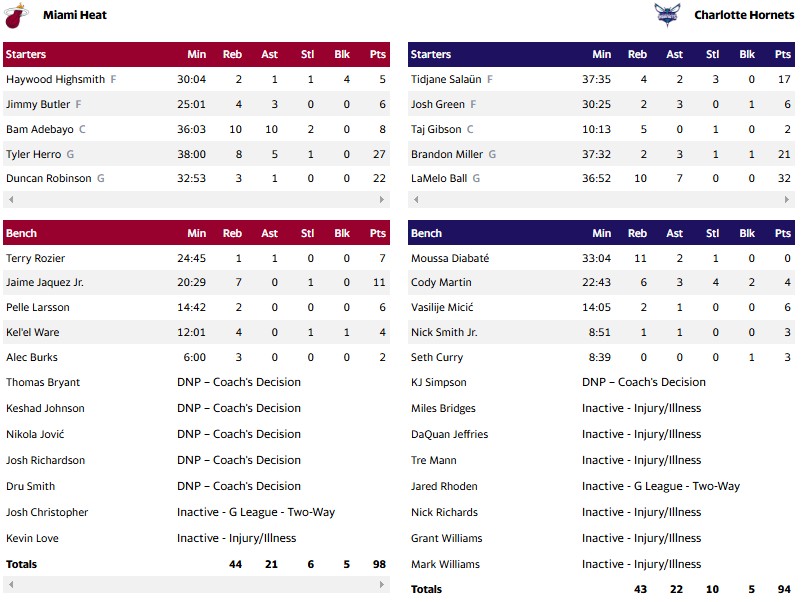 Χιτ και Χόρνετς επικεντρώθηκαν στην άμυνα και αυτό είχε ως αποτέλεσμα το χαμηλό σκορ που έβγαλε νικητές τους κόκκινους. Οι νικητές είχαν ως κύρια επιθετική αιχμή τους Χίρο και Ρόμπινσον με 27 και 22 πόντους αντίστοιχα.