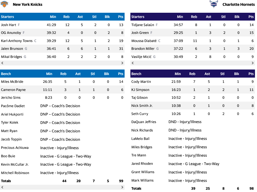 Σπουδαία νίκη για τους Νικς, που πέρασαν νικηφόρα από την Σάρλοτ, επικρατώντας των Χόρνετς με 99-98, στο πλαίσιο του NBA Cup.