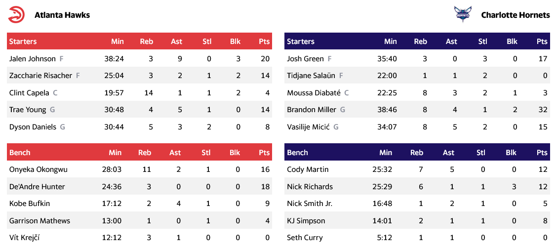 Οι Χοκς πανηγύρισαν ακόμα ένα σπουδαίο διπλό επικρατώντας της ομάδας του Σάρλοτ με σκορ 107-104. Για τους νικητές ξεχώρισαν οι Τζόνσον με 20 πόντους και 9 ασσίστ και Χάντερ με 18 πόντους, ενώ για τους Χόρνετς ο Μίλερ πέτυχε 32 πόντους.