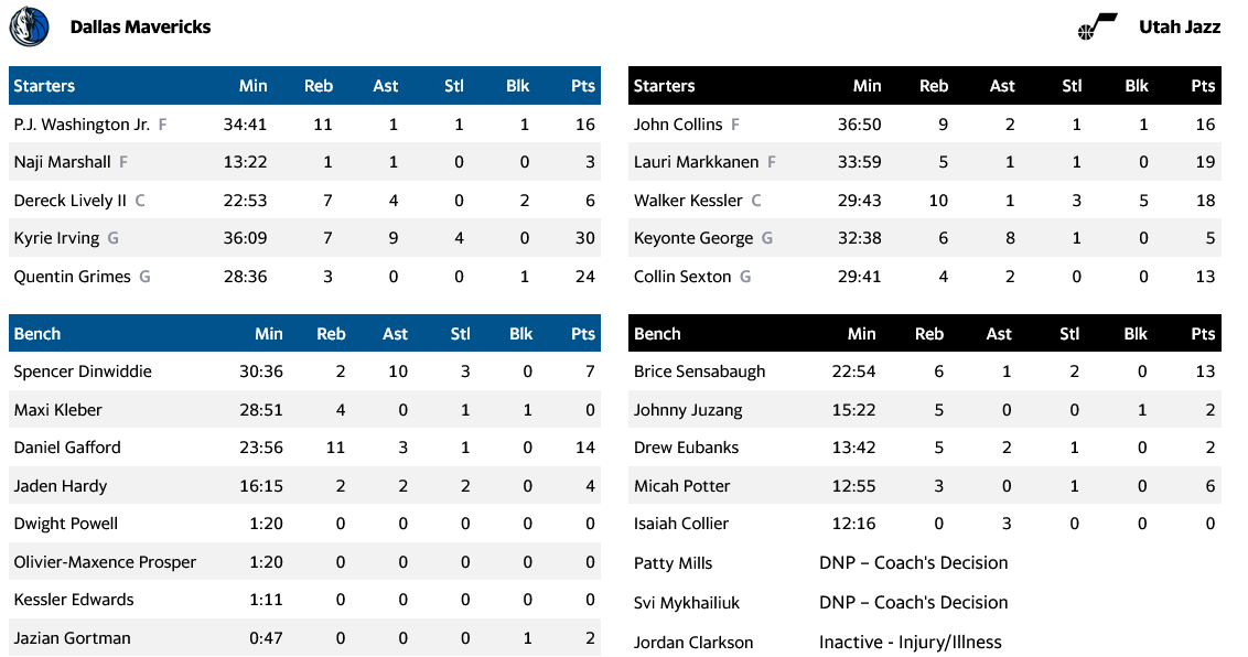 Οι Μάβερικς πέρασαν άνετα από την έδρα των Τζαζ, καθώς διαχειρίστηκαν εξαιρετικά την μεγάλη διαφορά που έχτισαν νωρίς στην αναμέτρηση. Πολυτιμότερος για τους Τεξανούς ήταν ο Ίρβινγκ με 30 πόντους, 9 ασίστ και 7 ριμπάουντ, με συμπαραστάτη τον Γκράιμς που είχε 24. Από τους Μορμόνους ξεχώρισε ο Κέσλερ με 18 πόντους και 10 ριμπάουντ.
