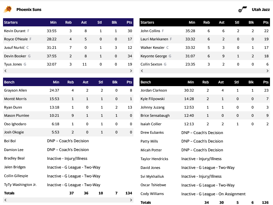 Για τους νικητές ο Μπούκερ σταμάτησε στους 34 πόντους, ενώ ο KD πρόσθεσε άλλους 30. Double double έκανε ο Τζόουνς με 19 πόντους και 11 ασσίστ.