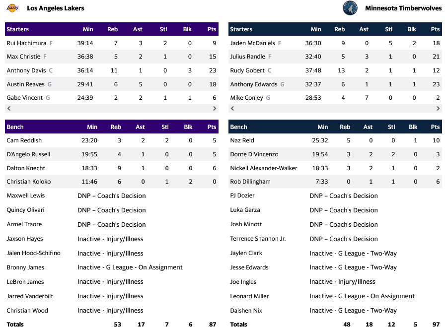 Σε κακ΄ο φεγγάρι βρίσκονται οι Λέικερς καθώς γνώρισαν την ήττα από τους Τίμπεργουλβς με σκορ 97-87, στο δεύτερο συνεχόμενο παιχνίδι που απουσίασε ο Λεμπρόν Τζέιμς. Μάλιστα για την ομάδα του Λος Άντζελες αυτή είναι η 8η ήττα στους 11 τελευταίους αγώνες.