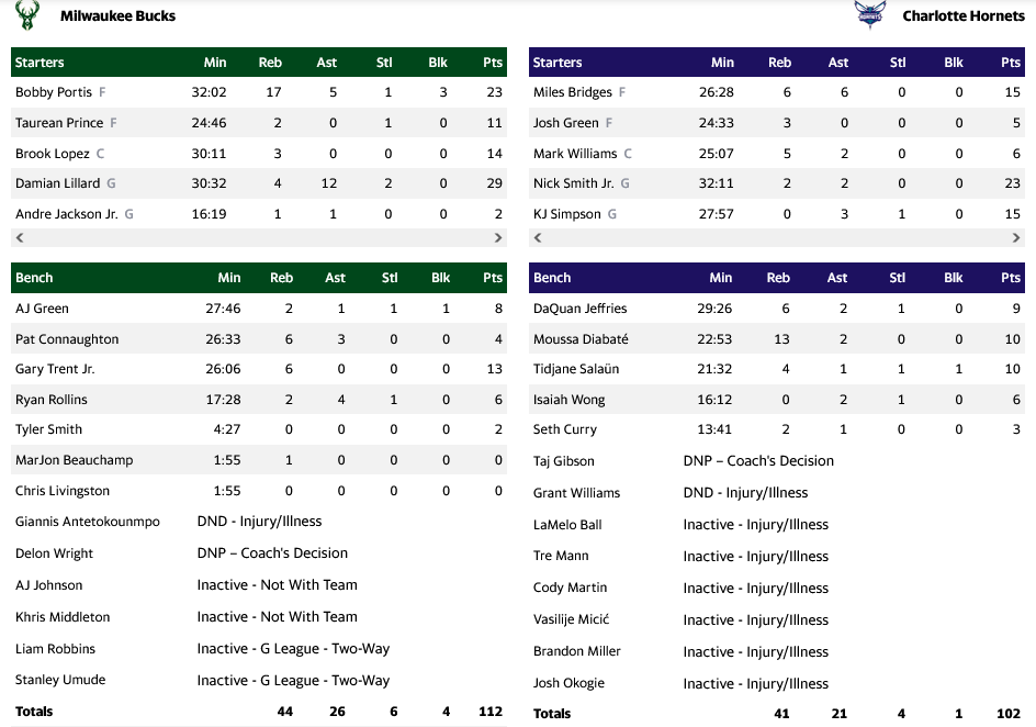 Η ομάδα από το Σικάγο είχε καθαρίσει από το πρώτο και όλας μέρος το παιχνίδι (59-44) και τελικά έφτασε στην νίκη με σκορ 109-95. Για τους νικητές πρώτος σκόρερ ήταν ο Ντοσούμνου με 19 πόντους και ακολούθησε ο Γουάιτ με 18. Για τους Χόρνετς ο Μίλερ είχε 21 πόντους και ακολούθησε ο Γουίλιαμς με 15 και 9 ριμπάουντ.