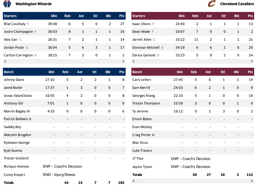 Με μία αντεπίθεση στα τελευταία λεπτά της τρίτης περιόδου οι Καβαλίερς επικράτησαν των Γουίζαρντς με σκορ 115-105. Για τους νικητές ξεχώρισαν οι Γκάρλαντ με 24 πόντους και Άλλεν με 21. Πρώτος σκόρερ για την ομάδα του Γουάσινγκτον ο Κουλιμπαλί με 27 πόντους.