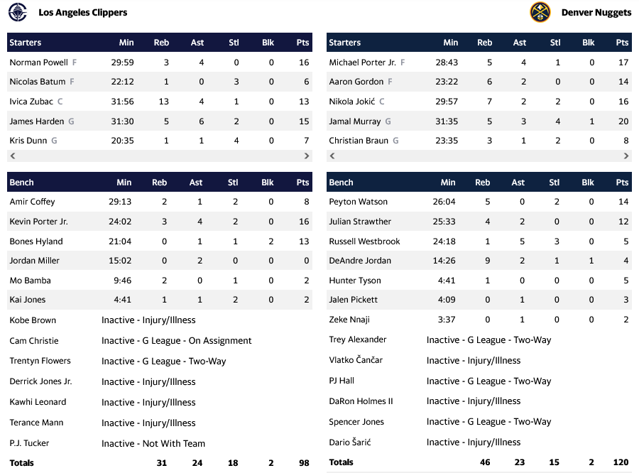 Η ομάδα από τον Ντένβερ δεν βρήκε καμία αντίσταση και χωρίς τον Γιόκιτς να τρελαίνει πανηγύρισε μια άνετη νίκη επί των Κλίπερς με σκορ 120-98. Για τους νικητές ξεχώρισαν οι Μάρει με 20 πόντους και Πόρτερ με 17. Χαμηλά έμεινε ο Γιόκιτς που είχε 16 πόντους και 7 ριμπάουντ. Για τους Κλίπερς πρώτος σκόρερ αναδείχθηκαν οι Πάουελ και Κέβιν Πόρτερ Τζούνιορ με 16 πόντους.
