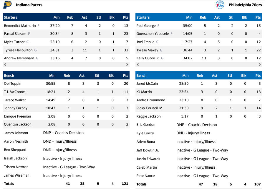 Από το πρώτο και όλας ημίχρονο οι Πέισερς είχαν δημιουργήσει μια διψήφια διαφορά (50-61), όπου την διατήρησαν και κατάφεραν και πανηγύρισαν την νίκη με σκορ 107-121. Για τους νικητές ξεχώρισα ο Χαλιμπέρτον με 32 πόντους και 11 ασσίστ και Σιάκαμ 23 πόντους με 8 ριμπάουντ. Για τους Σίξερς ο Μάξει είχε 22 πόντους και ο Τζορτζ 15. Για τους Σίξερς ξανά τραυματίστηκε ο Εμπίντ
