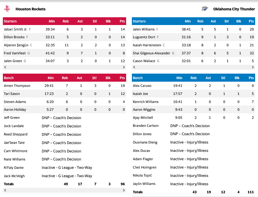 Οι Θάντερ επικράτησαν στον δεύτερο ημιτελικό του NBA Cup των Ρόκετς με σκορ 111-96 και επομένως θα αντιμετωπίσουν τους Μπακς στον τελικό της διοργάνωσης (18/12, 3:30).