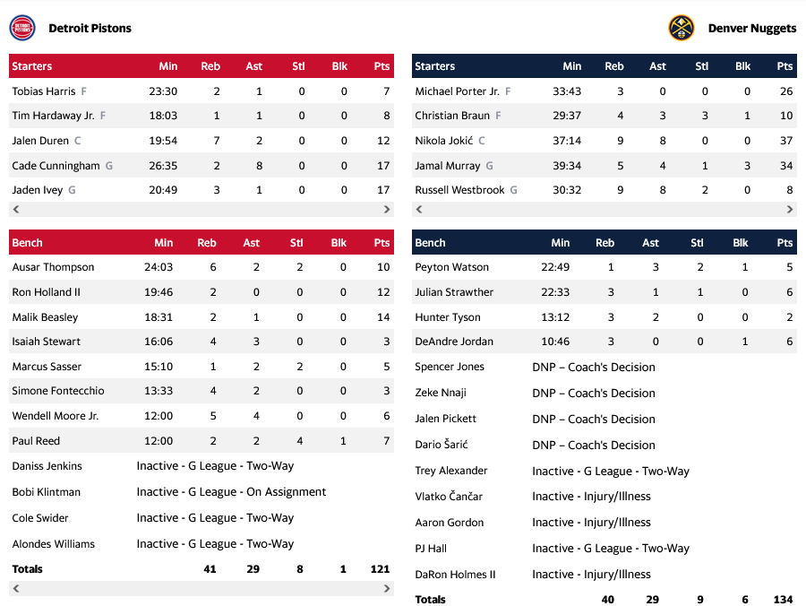 Με τον Νίκολα Γιόκιτς να κάνει… όργια, οι Νάγκετς δεν είχαν πρόβλημα να λυγίσουν τους Πίστονς, φτάνοντας στην νίκη με 134-121, που τους φέρνει στο 17-13.