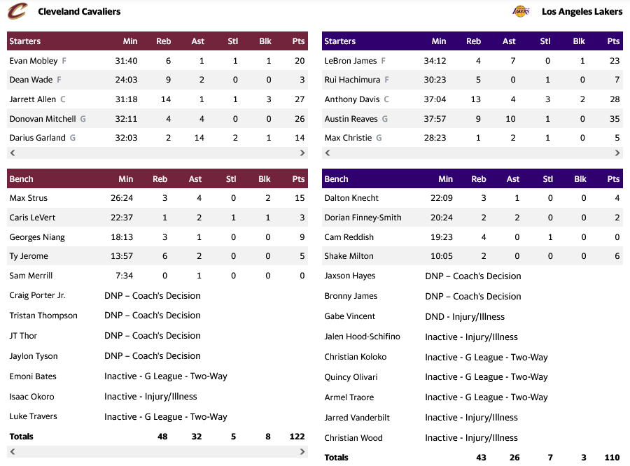 Για τους Λέικερς, ο Όστιν Ρίβερς ισοφάρισε το ρεκόρ καριέρας του με 35 πόντους, έχοντας παράλληλα 10 ασίστ και εννέα ριμπάουντ. Εξαιρετικός και ο Ντέιβις με 28 πόντους και 13 ριμπάουντ, με τον Λεμπρόν να έχει 23 πόντους.