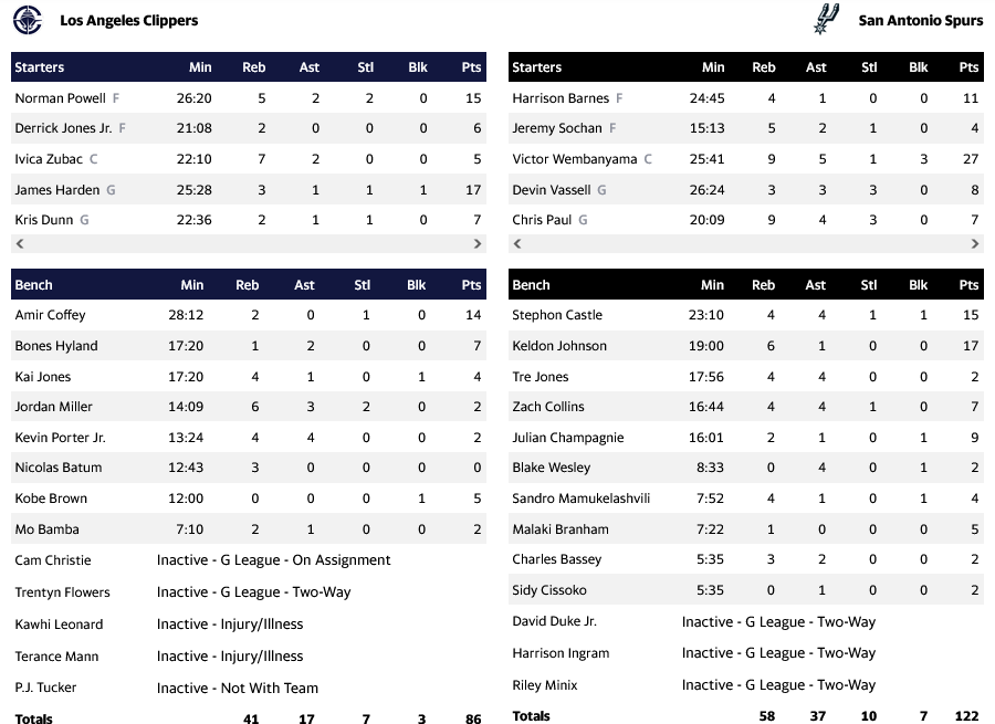 Εύκολο έργο είχαν οι Σπερς, που επιβλήθηκαν των Κλίπερς με 122-86, έχοντας τον Γουεμπανιαμά ως κορυφαίο με 27 πόντους, εννέα ριμπάουντ και πέντε ασίστ. Από κοντά και ο Τζόνσον με 16 πόντους, ενώ για το Λος Άντζελες, ο Χάρντεν είχε 17 πόντους.
