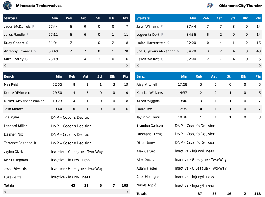 Ο άσος της Οκλαχόμα ήταν ισοπεδωτικός, έχοντας 40 πόντους, με τον Χάρτενσταϊν να ακολουθεί με 15 πόντους και 10 ριμπάουντ.
