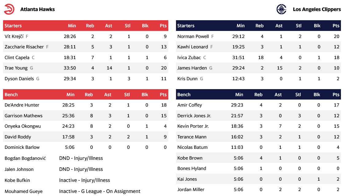 Πολυτιμότερος για τους νικητές ήταν ο Ίβιτσα Ζούμπατς με 18 πόντους, 18 ριμπάουντ και 4 ασίστ, με τον Νόρμαν Πάουελ να πετυχαίνει 20 πόντους, ενώ "μαέστρος" ήταν ο Χάρντεν με 10 πόντους και 15 ασίστ. Ο Λέοναρντ στην επιστροφή του σκόραρε 12 πόντους εν΄ω είχε και 3 ριμπάουντ. Για την Ατλάντα, ο Γιανγκ είχε 20 πόντους και 14 ασίστ, με τους Χ΄΄αντερ και Μάθιους να τον πλαισιώνουν με 18 και 15 αντίστοιχα.