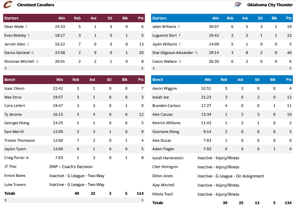 Για τους νικητές ξεχώρισε ο Αλεξάντερ με 40 πόντους και ακολούθησε ο Ντορτ με 22. Για τους Καβαλίερς πρώτος σκόρερ ήταν ο Γκάρλαντ με 20 πόντους.