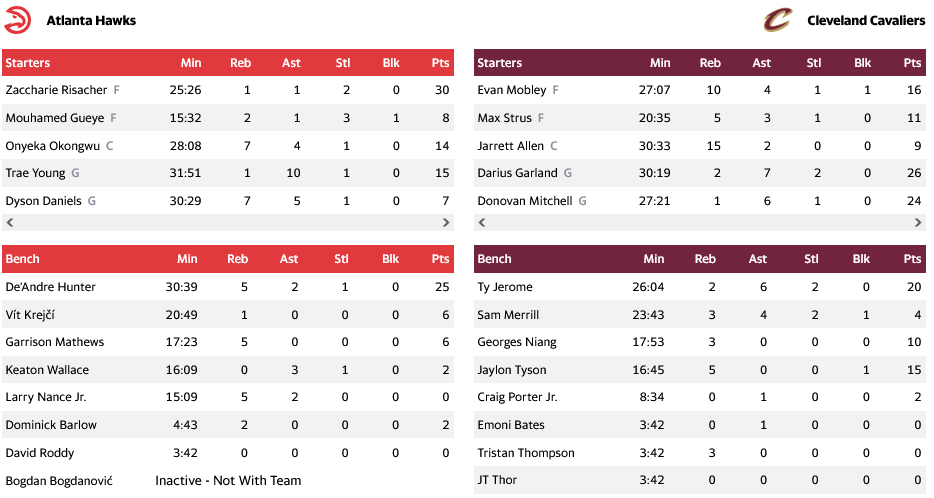 Οι Καβαλίερς δεν δυσκολεύτηκαν ιδιαίτερα απέναντι στους Χοκς, τους οποίους και υπ΄εταξαν μετά από σπουδαία εμφάνιση των συνηθισμένων "υπόπτων", Ντάριους Γκάρλαντ (26π, 7ασ, 2ρ) και Ντόνοβαν Μίτσελ (24π, 6ασ). Για την Ατλάντα ο Ζακαρί Ρισασέ πέτυχε 30 πόντους.