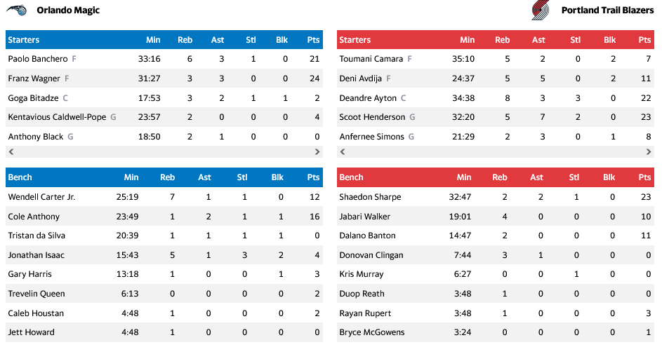 Το Πόρτλαντ βρίσκεται σε πολύ καλό "φεγγάρι", καθώς πήρε την 6η του νίκη σε 7 ματς, με τελευταίο του θύμα το Ορλάντο που διανύει περίοδο ντεφορμαρίσματος. Κορυφαίος για τους νικητές ήταν ο Σκουτ Χέντερσον με 23 πόντους, 7 ασίστ και 5 ριμπάουντ, με πολύτιμη βοήθεια από τον Σέντον Σαρπ που είχε επίσης 23, ενώ ο ΝτεΆντρε Έιτον είχε 22 πόντους και 8 ριμπάουντ. Από τους Μάτζικ, 24 είχε ο Φραντς Βάγκνερ και 21 ακόμη πρόσθεσε ο Πάολο Μπανκέρο.