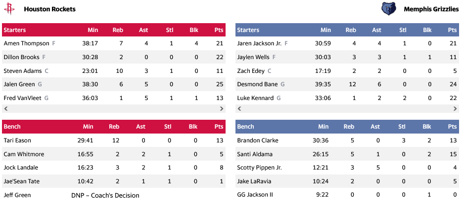 Κορυφαίος για τους νικητές ήταν ο Ντέσμοντ Μπέιν με 24 πόντους και 12 ριμπαόυντ, ενώ ο "clutch" Τζάρεν Τζάκσον πέτυχε 21. Από το Χιούστον ο Τζέιλεν Γκριν είχε 25 με τον Ντίλον Μπρουκς να προσθ΄ετει ακόμη 22.