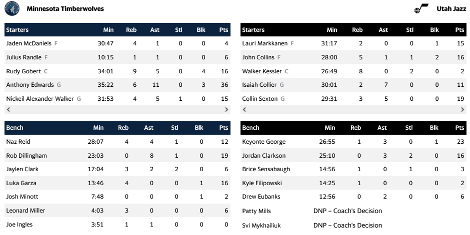 Οι Λύκοι πε΄ρασαν σχετικά άνετα από την έδρα των Μορμόνων, μετά από ένα πολύ δυναμικ΄ο δεύτερο ημίχρονο. Πολυτιμότερος ήταν ο Άντονι Έντουαρντς με 36 πόντους, 11 ασίστ και 6 ριμπάουντ, με συμπαραστάτες τους Ρομπ Ντίλιγχαμ (19π, 8ασ) και Ρούντι Γκομπέρ (16π, 9ρ). Από τη Γιούτα ο Κεγιόντε Τζορτζ είχε 23 πόντους.